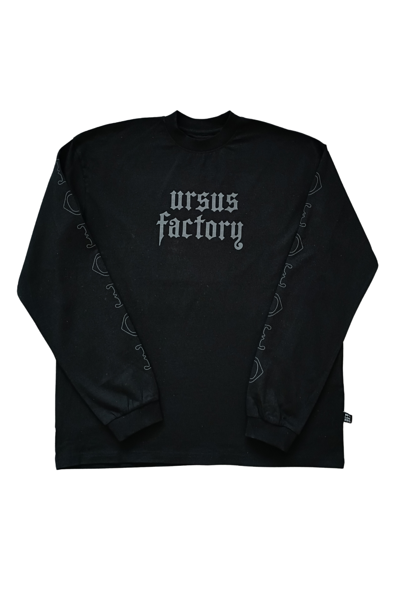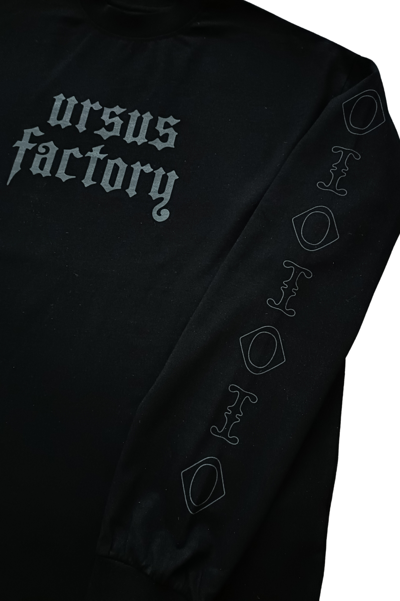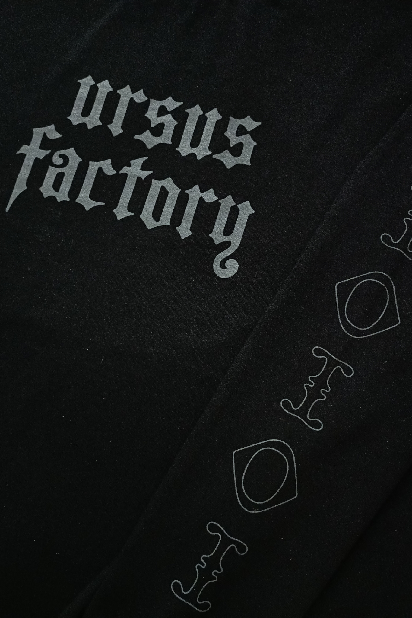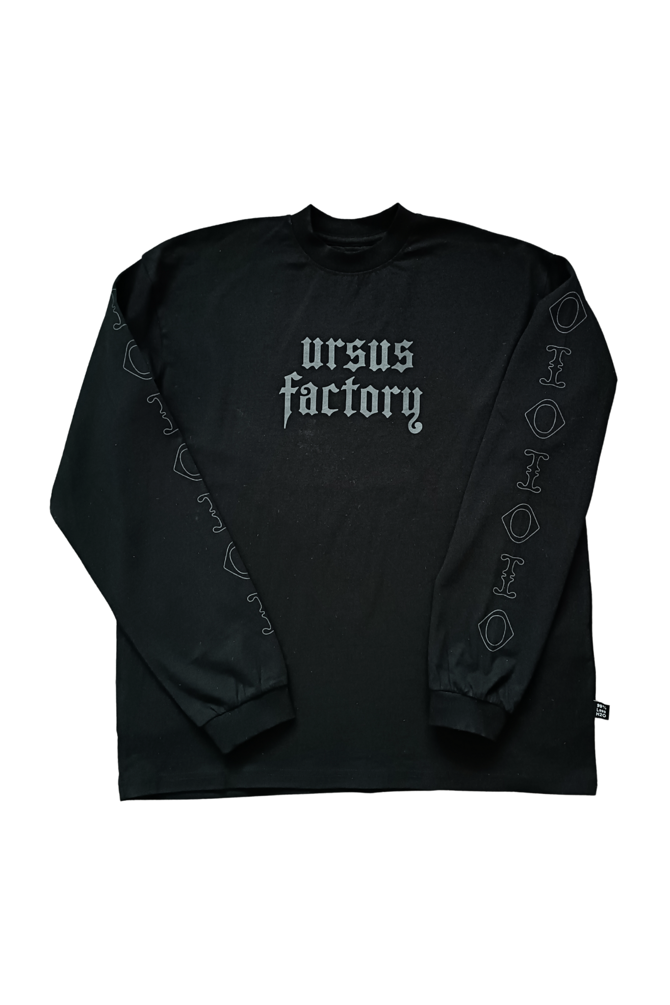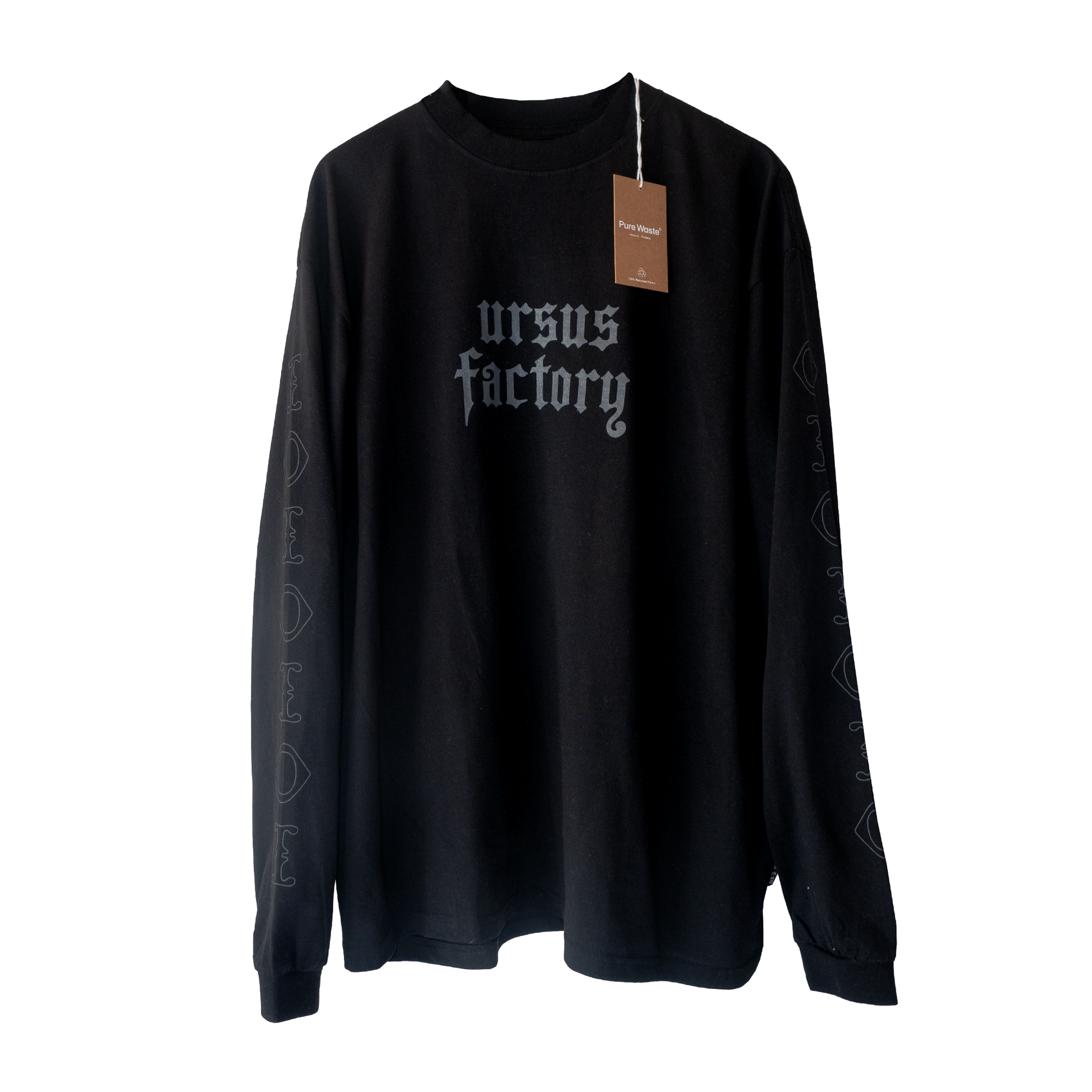 Mustassa Pure Wasten kierrätysmateriaaleista valmistetussa pitkähihaisessa unisex long sleevessä on painettuna etupuolella Ursus Factory-teksti sekä hihoihin IO-logoa. Paidan printin on suunnitellut Eemil Mäntynen.