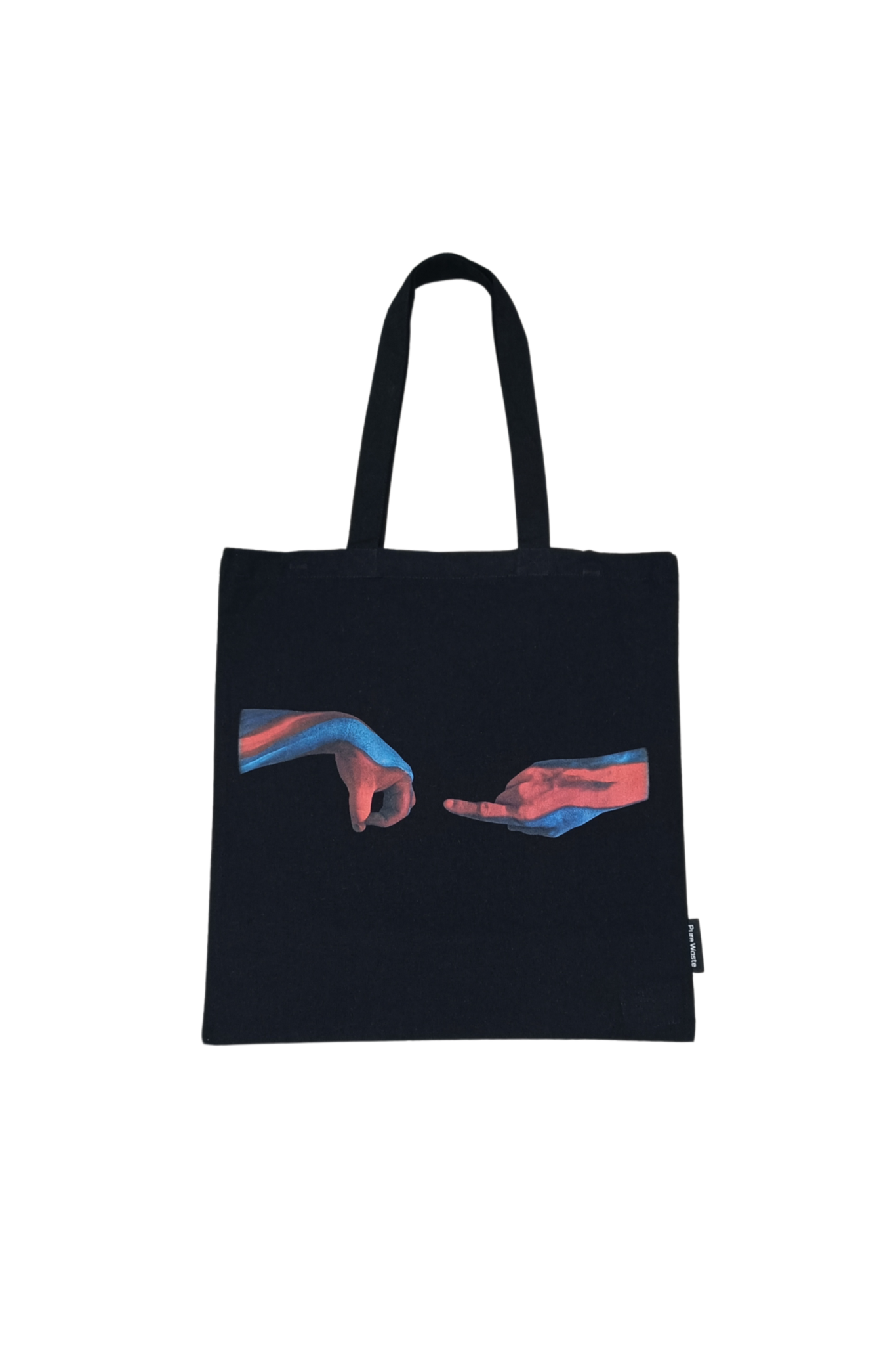 The black tote bag made from recycled materials by Pure Waste features a multi-colored Kädet print. The print was designed by Eemil Mäntynen from a photograph by Eliel Kilki, and the hands were painted by Riina Laine. The print is also available as a black shirt.