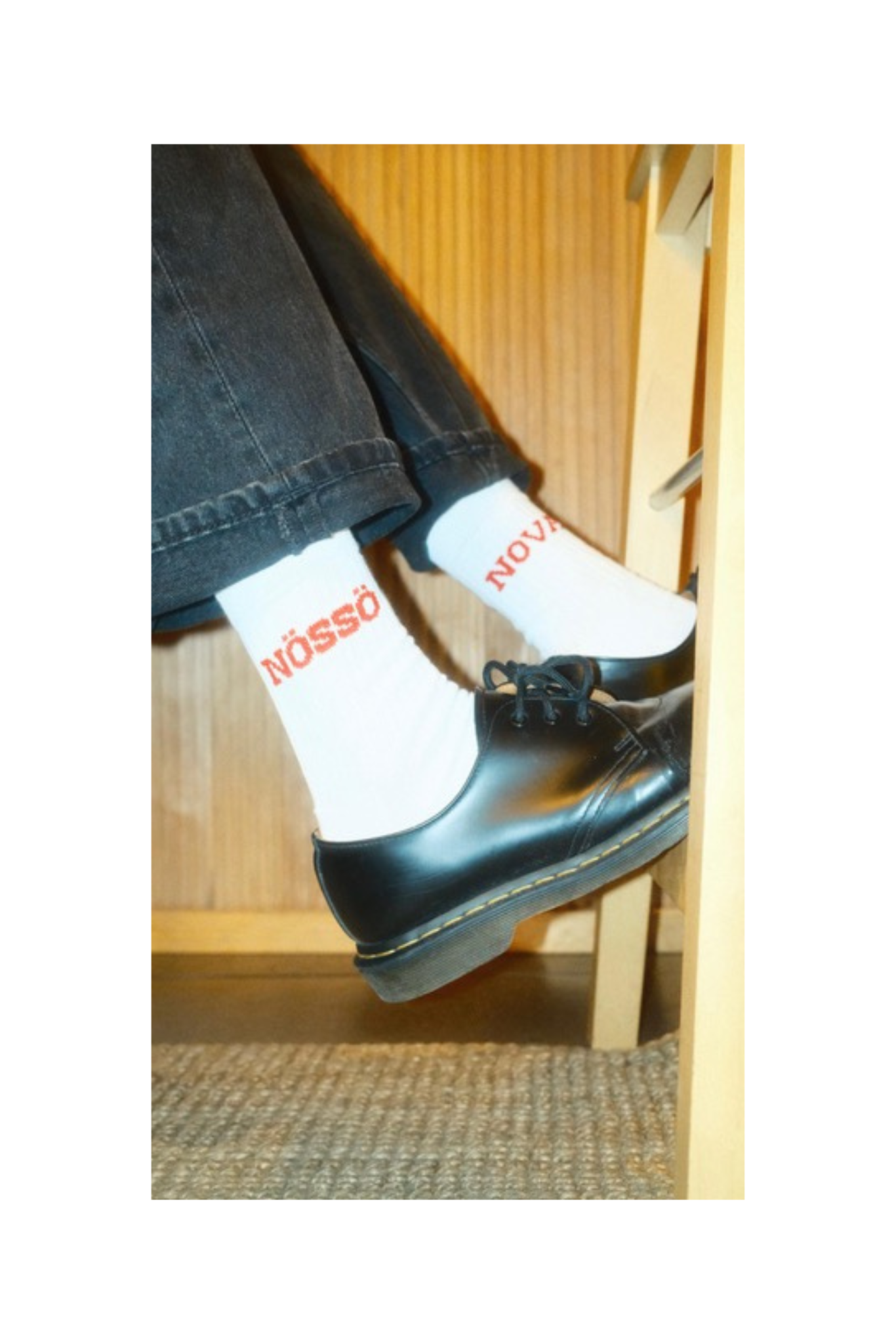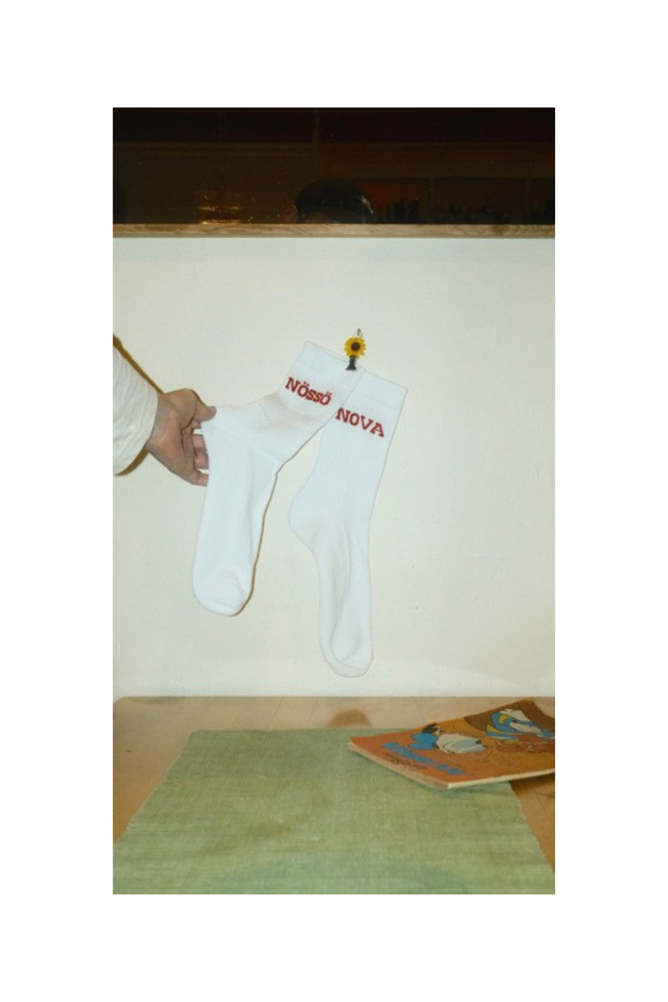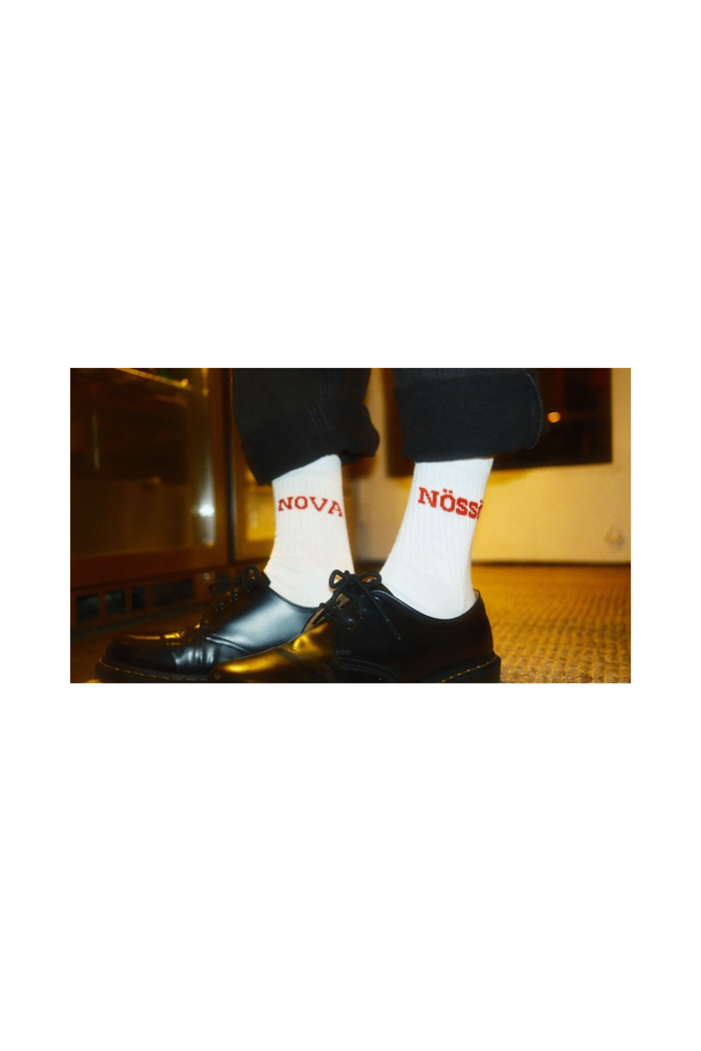 Valkoiset sukat joissa on molemmissa varsissa kudottuna Nössö Nova -teksti. Valmistettu vastuullisesti Suomen Mikkelissä Mi-sukka Oyn toimesta. Sukkien materiaali on puuvilla 80%, polyamidi 15% & elastaani 5%.