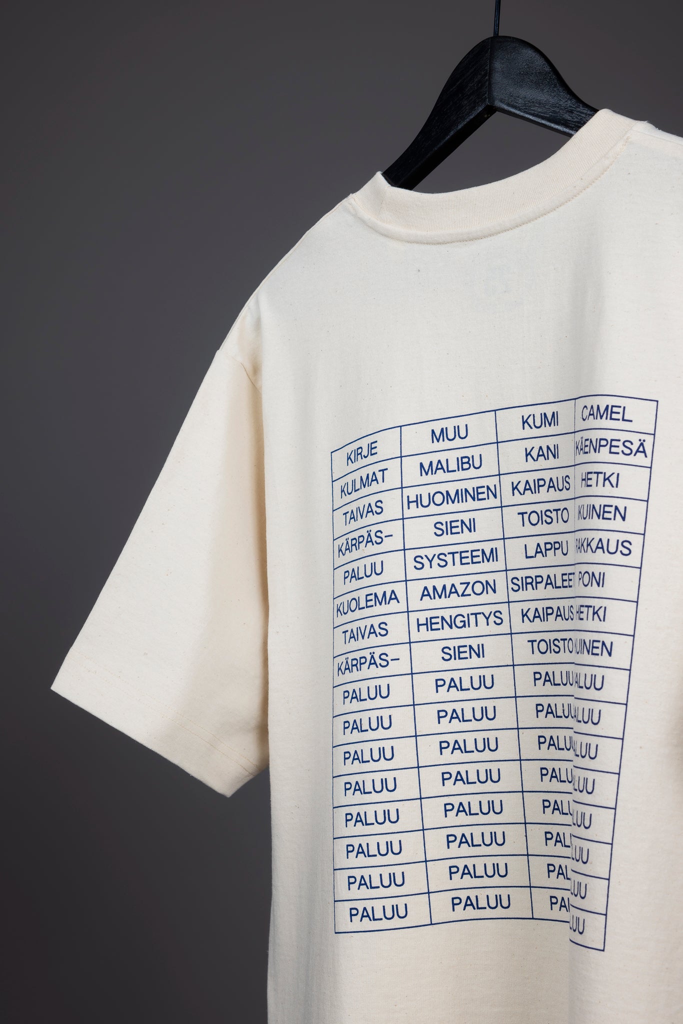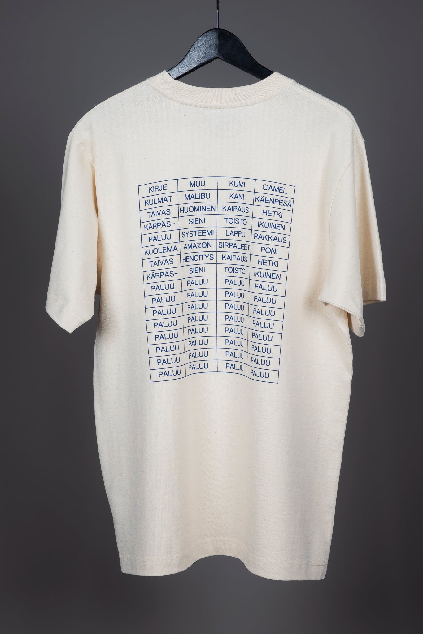 Jaakko Pallasvuon suunnittelema Paluu-kappaleesta inspiroitunut t-paita, jota on valmistettu kahdessa eri sävyssä - luonnonvalkoisena sekä vintagepestynä mustana. Molempia värejä on valmistettu yhteensä sata kappaletta ja jokainen t-paita on numeroitu - niskan sisäpuolelle on painettuna numero 1-200 väliltä.