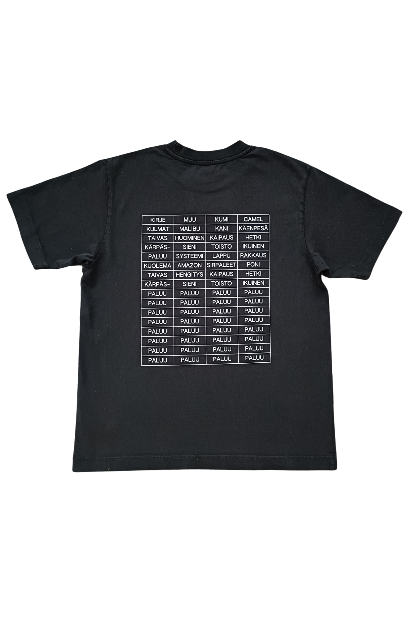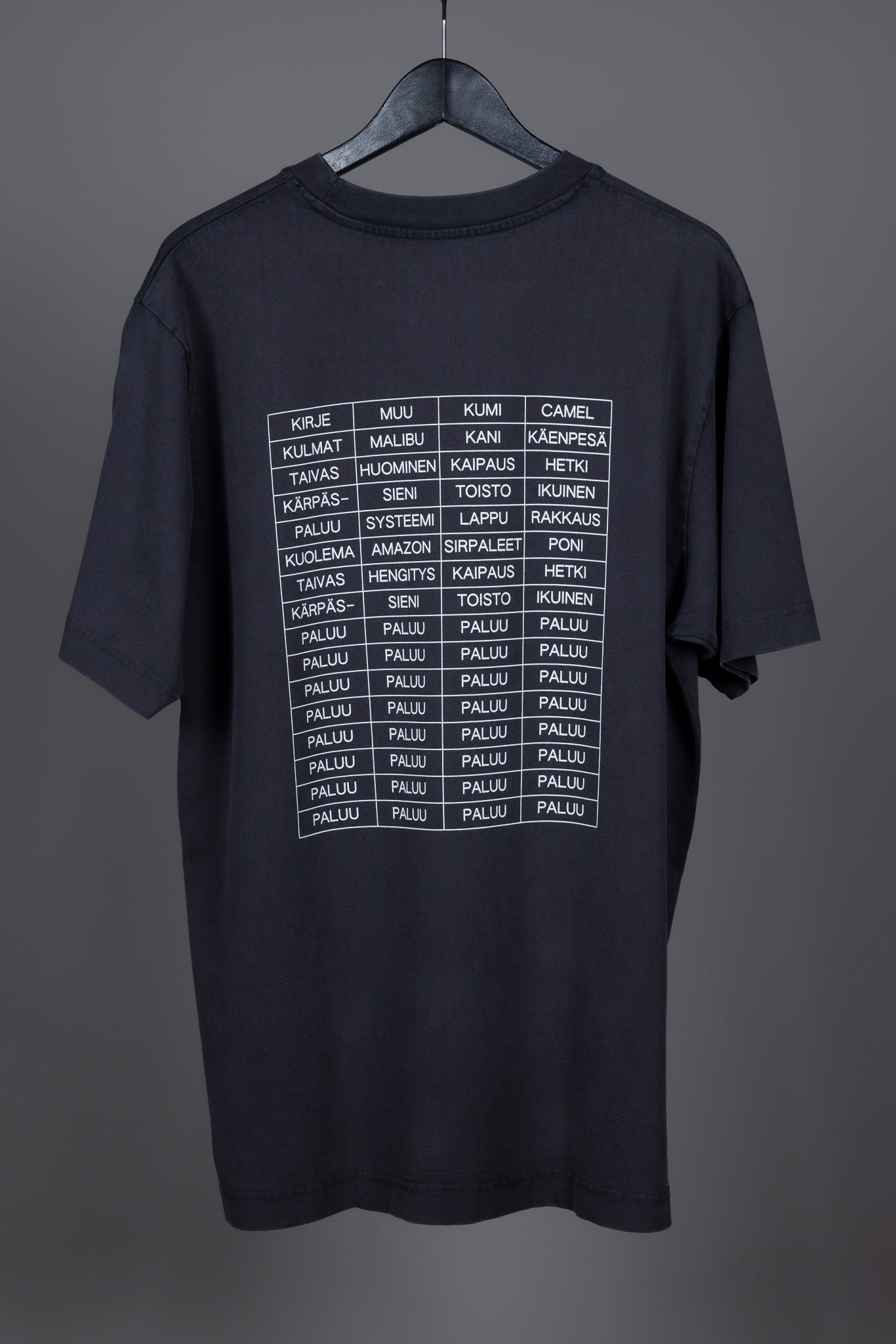 Jaakko Pallasvuon suunnittelema Paluu-kappaleesta inspiroitunut t-paita, jota on valmistettu kahdessa eri sävyssä - luonnonvalkoisena sekä vintagepestynä mustana. Molempia värejä on valmistettu yhteensä sata kappaletta ja jokainen t-paita on numeroitu - niskan sisäpuolelle on painettuna numero 1-200 väliltä.