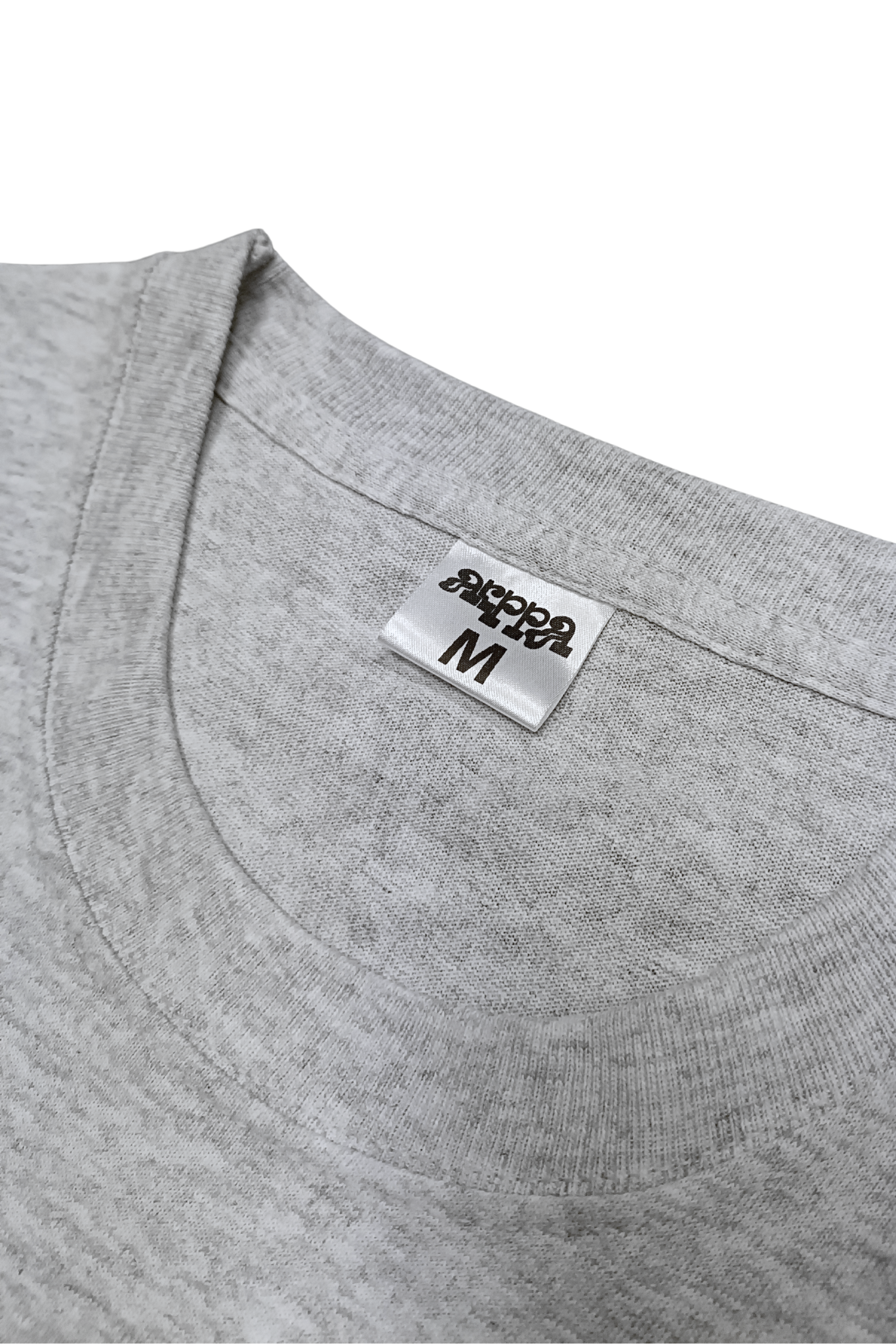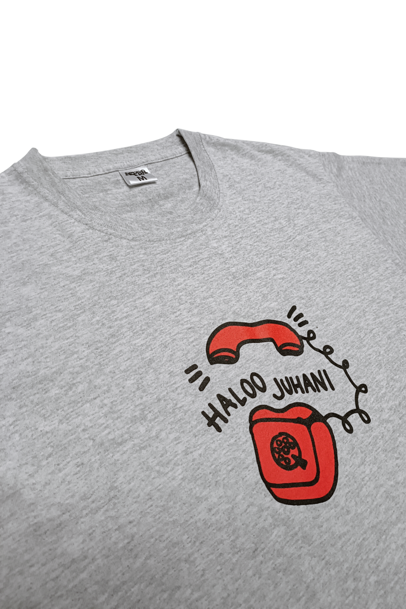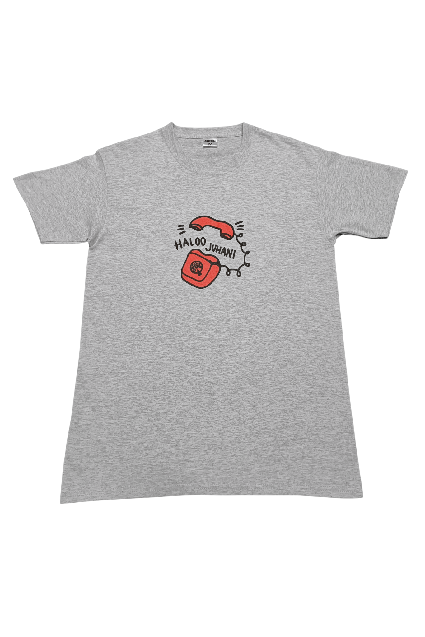 Harmaa t-paita, jossa on edessä silkkipainettu Haloo Juhani -printti. Fruit of the Loomin Heavy Cotton classic fit t-paidan materiaali on 100 % puuvillaa ja t-paita on paksuudeltaan 195 g/m².