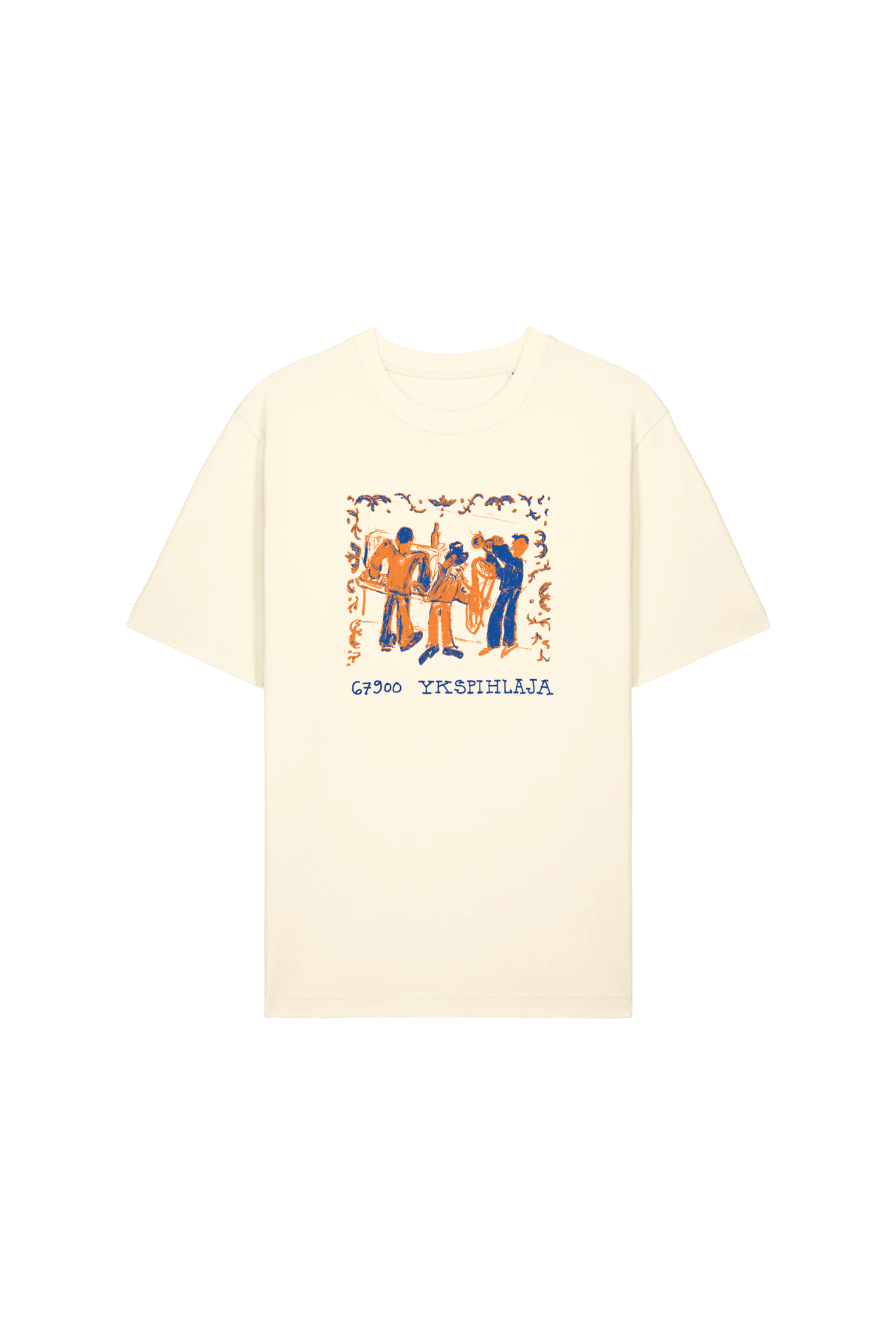 Vaalea kerman värinen t-paita, jossa silkkipainolla eteen painettu Toivo Heinimäen suunnittelema printti. Stanley & Stellan rennon mitoituksen Freestyler t-paidan materiaali on 100% orgaanista puuvillaa. Tarkistathan paidan tarkemman mitoituksen kokotaulukosta. Paita on perinteistä t-paitaa paksumpaa materiaalia ja on paksuudeltaan 240g/m².