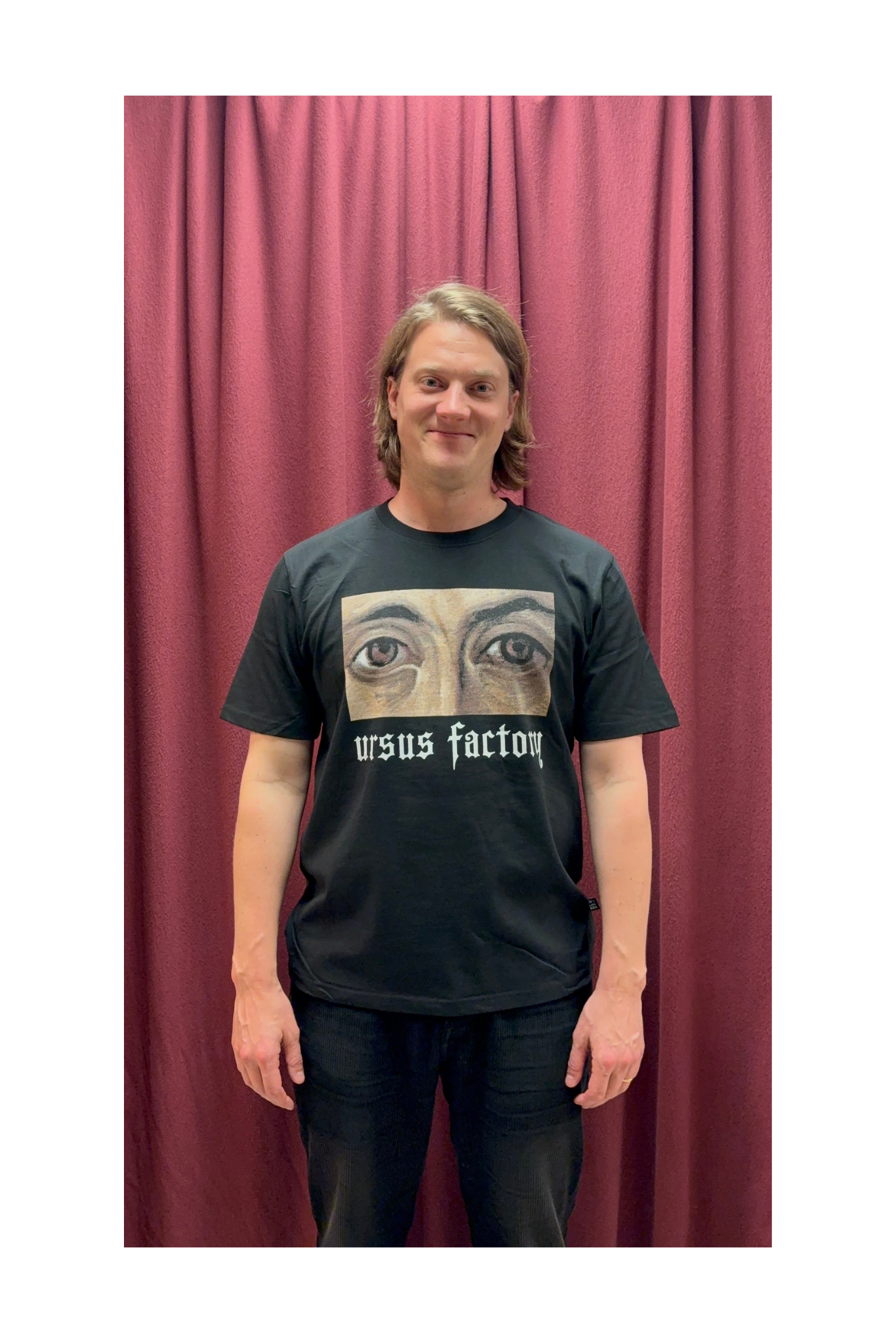 Musta t-paita jossa on painettuna monivärinen Oletko siellä -singlen kannesta tuttu Eemil Mäntysen suunnittelema printti sekä Ursus Factory -teksti. Paidan malli on Pure Wasten unisex Loose fit ja se on valmistettu kierrätysmateriaalista.