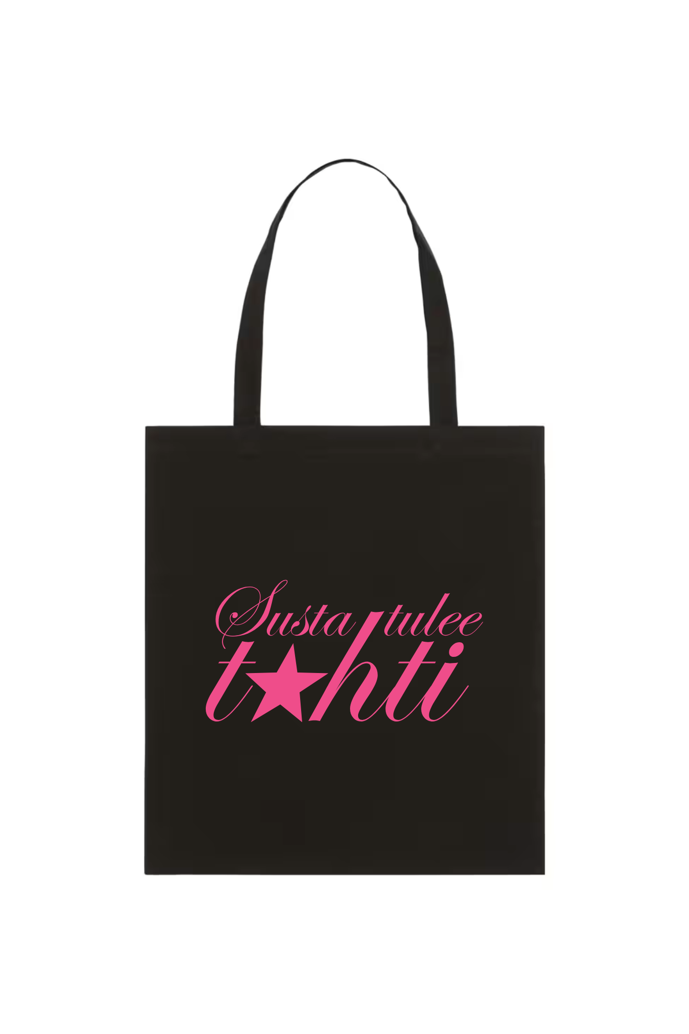 Mustan kangaskassin toiselle puolelle on painettuna Susta tulee tähti -teksti. Kangaskassi on kooltaan 42 cm x 37 cm ja hihnojen pituus on 65 cm.