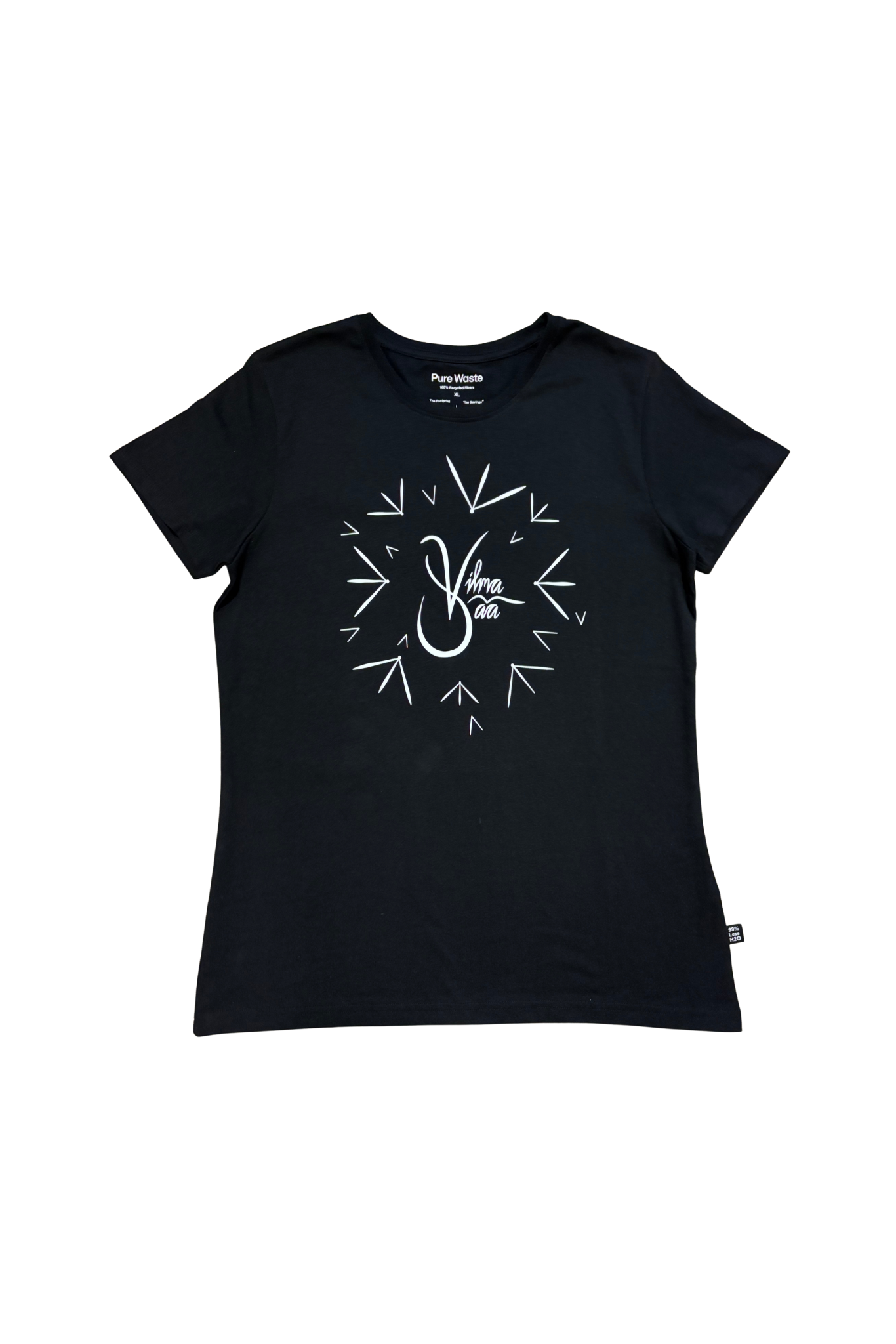 Mustassa Pure Wasten kierrätysmateriaaleista valmistetussa Lady fit t-paidassa on painettuna Vilma Jää -printti, jonka on suunnitellut Norma Lauritsalo.